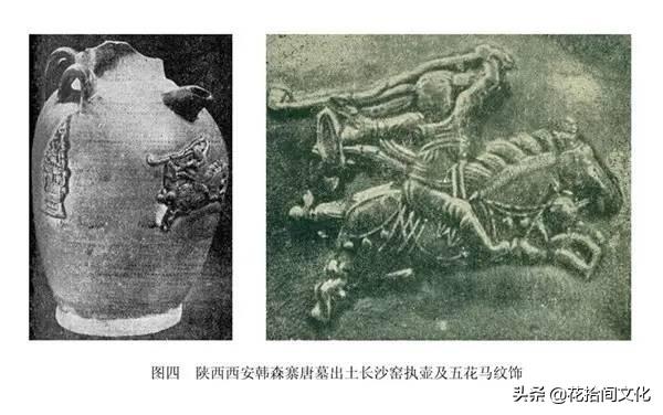 1955年西安韩森寨唐墓出土过一把执壶。从壶的形制和装饰来看。是唐代长沙窑的产品。执壶腹部以模印贴花的形式装饰了一匹五花马的形象。骑在马上的人物似持盾舞剑。马颈部的鬃毛被修剪成五瓣花状。这也是目前所见的唯一可以确认的五花马图像资料。这件五花马实物 资料的发现。为以往学界认为的五花马就是将马鬃剪成五瓣的说法。提供了有力的实物支撑。