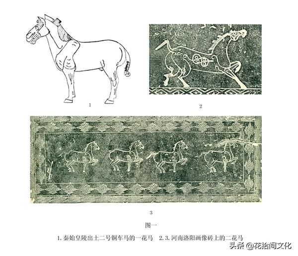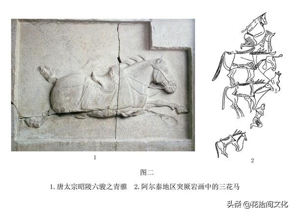 汉代的画像砖上也常见一花和二花马 。但不见三花马。如河南洛阳出土画像砖上的二花马。到了唐代。则主要流行三花马。而且三花的来源可以分为两个系统。一个突厥系统。主要以唐太宗昭陵的浮雕六骏为代表。马颈部的鬃毛剪成弯刀状。