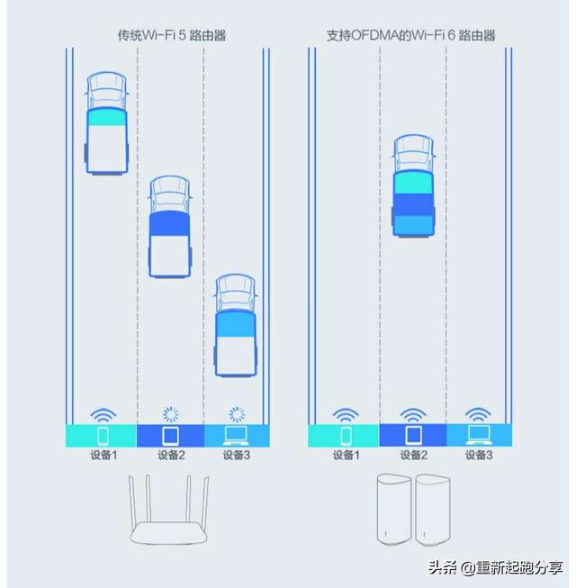 WiFi 6还采用了OFDMA(正交频分多址)技术。它是WiFi 5所采用的OFDM技术升级版。允许不同用户共用同一个信道。允许更多设备接入。响应时间更短。延时更低。也就是让不同设备上网数据合并传输。提升传输效率。减少信息的空置和排队。