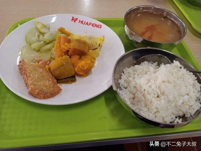 中午下午还有夜宵(上夜班才有)都是米饭三菜一汤。菜也不是特别好。但对于我们从农村出来打工的来说算不错了。一荤两素肥肉比较多。还有就是空心菜基本上每顿都有。其他的就白菜、包菜、豆芽、花菜等等。偶尔有鸡腿和鱼。汤基本上就是紫菜蛋花汤。我个人觉得挺不错的。至少比我在农村老家吃的好点
