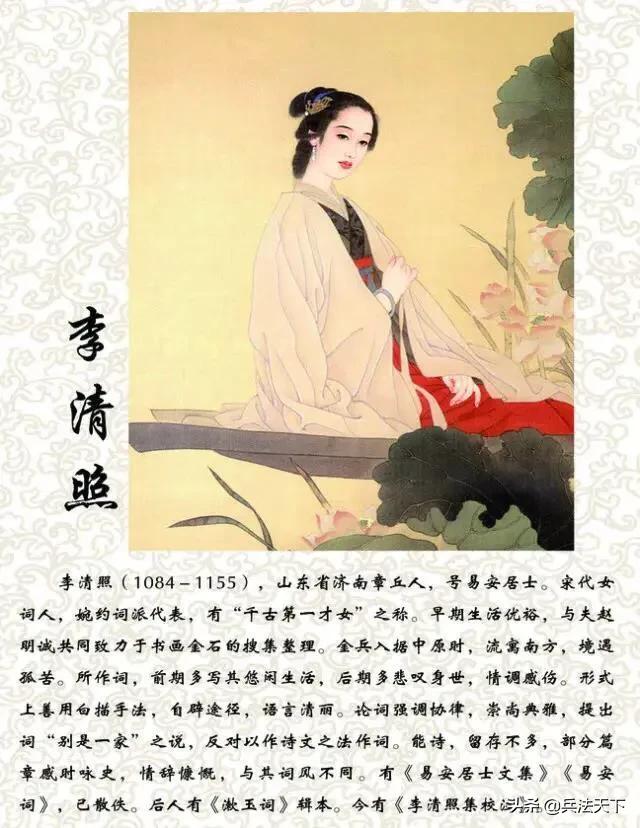 李清照生于南北宋交接的时期。她擅长书、画。通晓金石。而尤其擅长音律与诗词。她的词作流传千古。被誉为“词家一大宗”。李清照