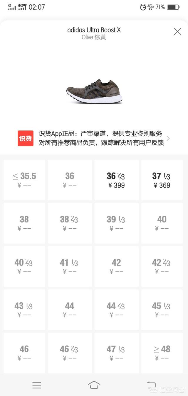不过个人觉得这个boost底没有ultraboost的底软。所以我又推荐这款ultra boost x。底真的很软弹。而且价格可能更加便宜。但是呢。这双鞋的码子非常稀少。我在识货上面只看到了40左右少数几个码。所以比较适合女生去挑挑看。小脚男生也有福了。因为我一般是在识货上面买鞋子。所以毒或者其他买东西软件我也不知道有没有这双的其他码。所以我也不能肯定。