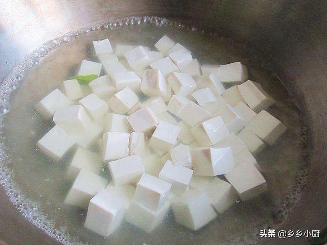 南豆腐切1.5厘米见方的块。淖水加盐淖透倒出控水。