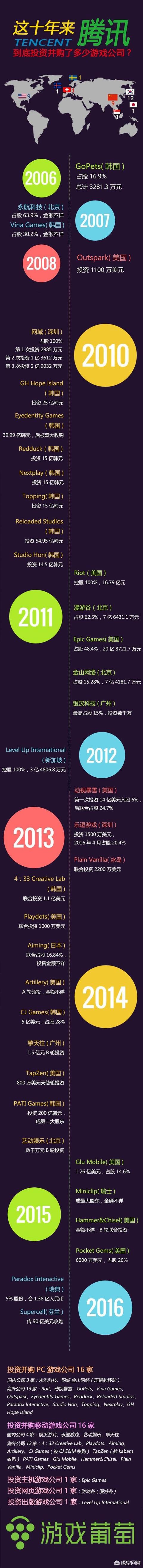 腾讯有什么游戏?我想世面上随便找10款就会有一半属于腾讯家的。而被腾讯收购并购的游戏公司也可以用香飘飘广告来形容:加起来可以绕地球一圈。