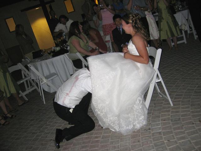 北美地区还有更恶俗的。呃。据说也是古方——新郎当宾客的面钻新娘的裙子。亲手把袜带扒下来。然后扔给宾客。