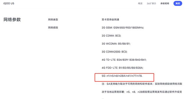 至于为什么?直接给大家举一个实例。下面第一张截图是VIVO旗下的一款5G入门机——IQOO U5。目前售价在1100元左右。支持n1/n5/n8/n28A/n41/n77/n78等7个5G频段。下图则是红米某千元机(售价接近)。只支持n1|n28A|n41|n78四个5G频段。