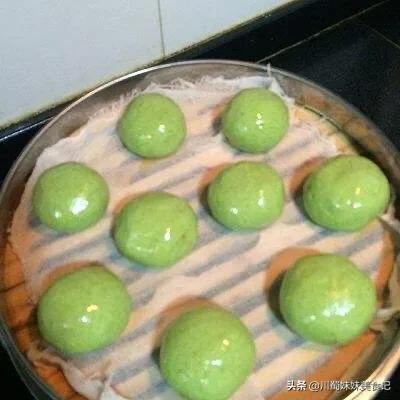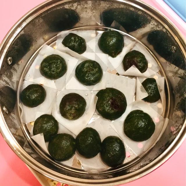 包好的豆沙青团。放在蒸锅里蒸十五分钟。