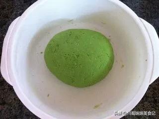 将菠菜汁和糯米粉混合。和成光滑的面团。