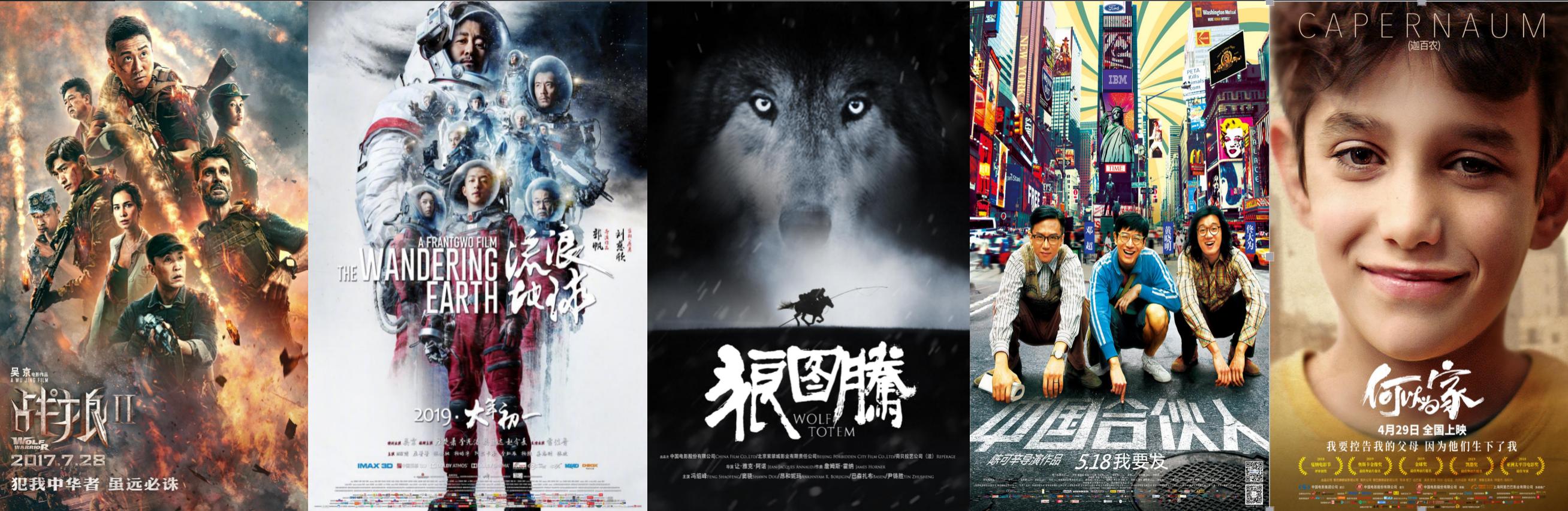 分别是《战狼2》、《流浪地球》、《狼图腾》、《中国合伙人》和《何以为家》。