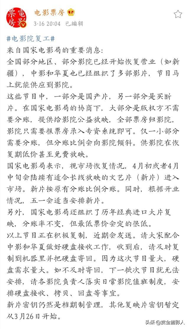 好在中国国家电影局出手救电影院。联合中影集团组织经典电影重映。票房收入全部留在电影院。详细情况可移步我写的关于国家电影局用意的文章。希望此举能缓解影院压力。