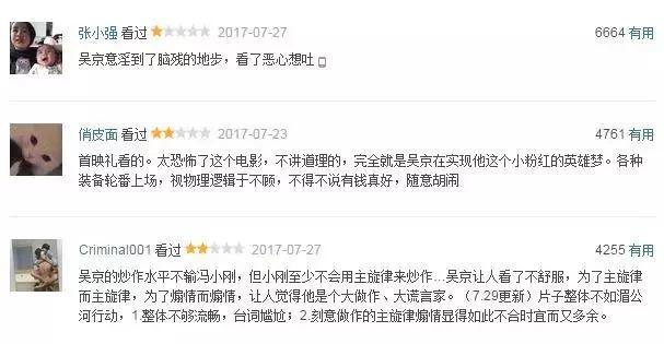 还有人吐槽吴京在影片里怎么也打不死。一个人打几十个。