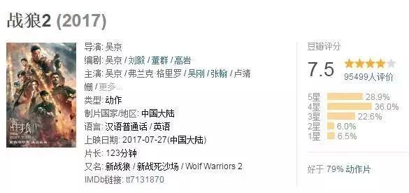 《战狼2》当然不算完美。大海印象最深的就是有几段bgm的切入比较唐突。不过目前豆瓣9万名网友平均给出7.5的打分。对于国产片也算比较高的分数了。不仅远超《战狼1》的6.8分。也超过了席卷内地票房的《速度与激情8》(7.1分)和《神奇女侠》(7.2分)。