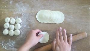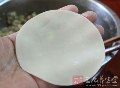 擀皮:左右手配合、逆时针转动饺子皮、用转动均匀的角度配上均匀的擀面的力度就可以擀出圆整的面皮。面皮要求:直径8厘米、大小圆整、中间厚两边薄、表面清爽光滑。
