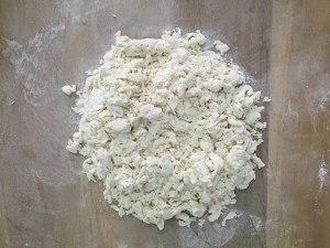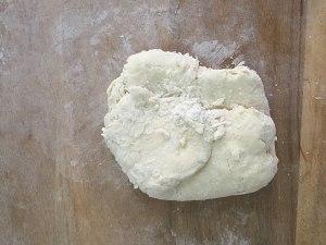 4.取一作法5的小面糰。以桿面棍桿从面糰的中心点桿出。再将桿面棍拉回。重覆的将面糰桿成圆扁状。中间有微凸起状即可。