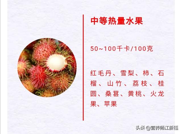 注意:这类水果热量居中。100克相当于半碗多一些的米饭的热量。可以适当选择。