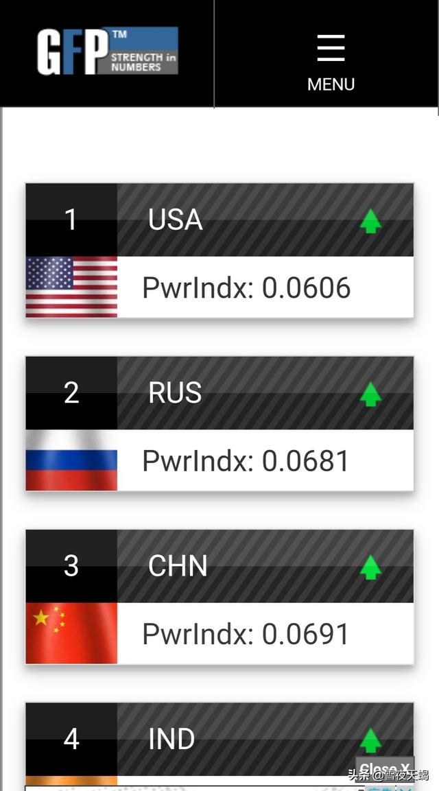 根据2020年全球火力指数排名。美、俄和中国列前三位。印度第四。越南第22位。