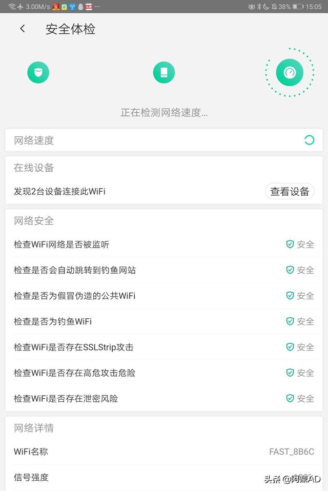 [应邀回答]有的。最靠谱的是腾讯wifi管家。测家里的宽带。还有加速功能。可以清理网络的垃圾。使用安全檢查。深度测速功能。就可以看到信号强度。连接上你的热点有多少台设备及型号。测速后也能看到你的速度相当于多少兆。网速是否超快。刚才去app那里又体验了一把并截屏3个作为配图。↓