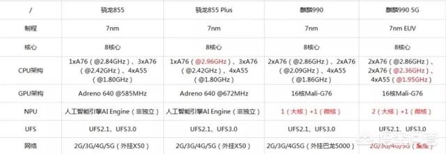 而且从处理器参数上。高通骁龙855 Plus确实要比麒麟990 4G版更胜一筹。骁龙855 Plus的最高主频是2.96GHz。而麒麟990的最高主频是2.86GHz。尽管麒麟990有两个超大核。骁龙855 Plus只有一个超大核。但是骁龙855 Plus有三个A76大核。麒麟990只有两个。主频也稍低一些只有2.36GHz。麒麟990的优势是小核数量频率一些。4个A55核心都是1.95GHz。而骁龙855 Plus的四个A55小核都是1.8GHz。由于跑分主要是考验超大核和大核。所以骁龙855 Plus的整体性能更胜一筹。跑分成绩也更高一些。