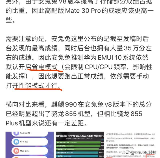 最后。安兔兔也对排行榜上没有华为手机给出了解释:由于华为的EMUI系统默认是开启“省电模式”的。所以在跑分过程中未能充分发挥出应有的性能水准。大量华为Mate 30 Pro用户的跑分成绩都在30W分左右。这就是开启了“省电模式”所致。而安兔兔给出的分数是按照用户的平均分来计算的。这些在“性能模式”下的跑分成绩就拖了华为Mate 30 Pro整体分数的后腿。