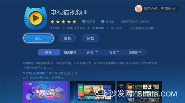 电视猫视频是一款视频应用。只为家庭而生。可安装在小米电视4A或者智能盒子(如小米盒子)上。目前正在为千万家庭用户提供汇聚互联网各大视频网站的海量点播。以及央视/卫视/地方台的直播频道和7×24小时回看。精选网络直播节目登陆直播频道。新闻、电竞直播比传统电视更精彩。优化首页内容更新更及时。资讯短片首页支持视频联播功能。
