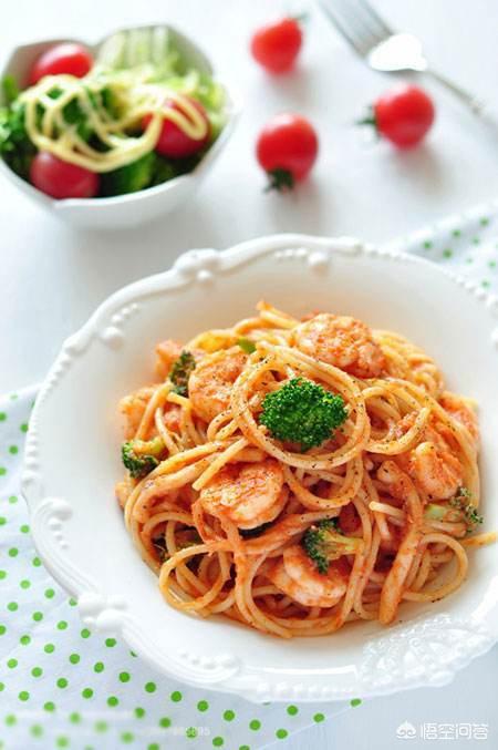 意面:将意大利面放入沸水煮8分钟。然后加入食用油并搅拌。以防粘在一起。虾。番茄片。罗勒。洋葱。番茄酱。黑胡椒片。一点蒜泥。一点黄油。锅中放入食用油、蒜泥、葱花、炒菜、西红柿碎。炒熟后。加入番茄酱。放虾。虾熟时放黄油。黄油融化后放面食。搅拌均匀。加入罗勒和盐调味。开锅前加少许黑胡椒。不要过多。