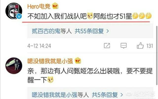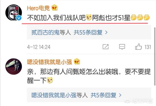 hero电竞也在下面请问加入我们的战队吧。表示阿彪也才51颗星。娄艺潇的水平竟然可以和职业选手一样。可见娄艺潇的水平是有多高了。完全可以加入他们的战队和他们一起打比赛。但是hero官方也只是调侃一下而已。也不是他第1次调侃了不过阿标真是躺着都中枪呀。默默心疼阿彪三秒钟。娄艺潇也不可能去打比赛的。人家也是一个大明星演戏才是他们的真正工作。游戏也只是娱乐一下而已。