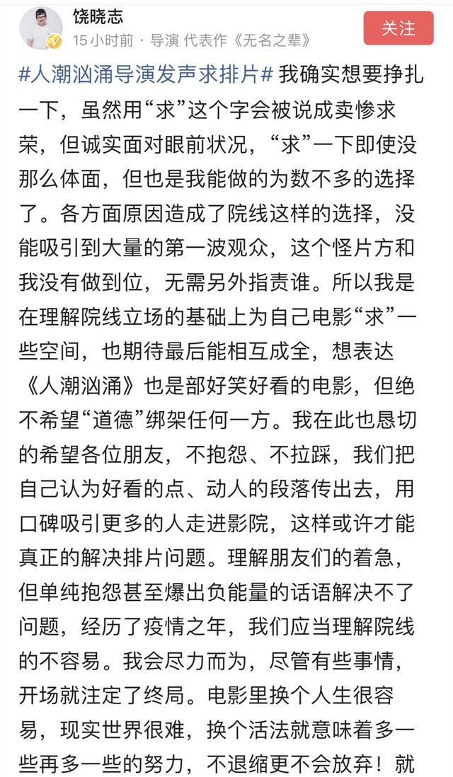 但随着导演饶晓志发文呼吁影院增加排片。以及《人潮汹涌》不错的口碑。排片逐渐开始上涨。