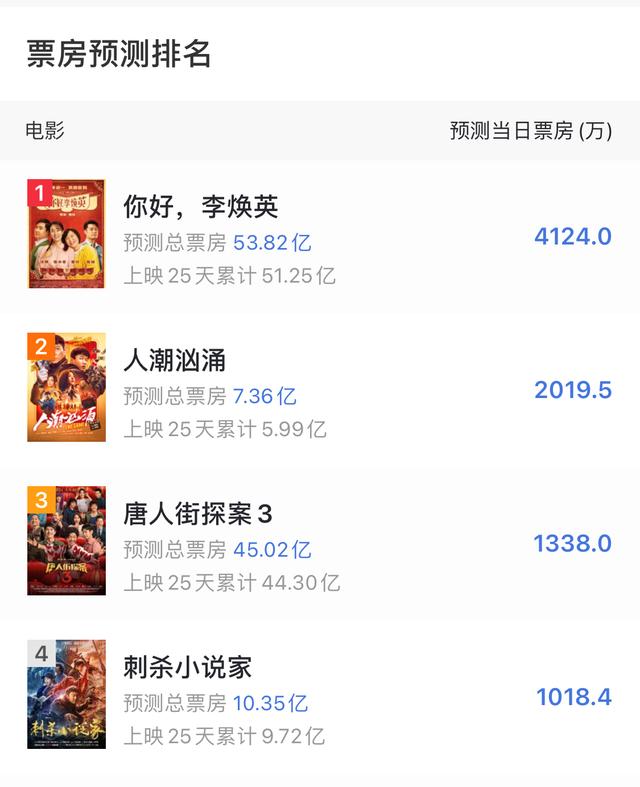 等它追赶上来的时候。春节档已经步入尾声。大家都进入工作模式了。红利期也已经过了。所以即便《人潮汹涌》现在排片上升到第2位。也不过每天不到2000万的票房。
