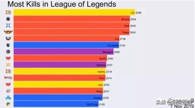 在今日。来自于油管的Up主macarrony00发布了一则关于英雄联盟选手总击杀数变化的视频。从中我们可以看到很多熟悉的ID。例如UZI,XIAOHU。FAKER等。这些耳熟能详的ID代表着一个又一个时代。虽然他们现在可能没有这么强大的统治力了。但是属于他们的辉煌早已刻入历史。青史留名。从表中我们可以看到UZI以绝对的优势超过 FAKER登顶。而且远高于第二第三名。
