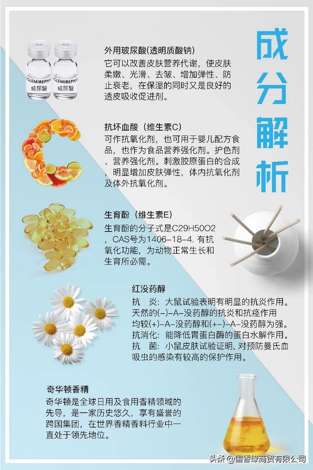品质洗护原料中再增加:1.小分子外用玻尿酸、2.红没药醇:抗炎、抗消化、 抗菌3.生育酚(维生素E)4.抗坏血酸(维生素C)5.奇华顿香精等提升新一代洗护产品功效。