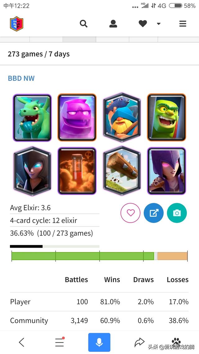 这套卡组的胜率高达54.11%。并且这个胜率是基于77501场游戏对决而来。平均每场的皇冠是1.15(该数据来自statsroyale) 。非常完美数据。不是每一套经典卡组的胜率都能超过50%的多哦。