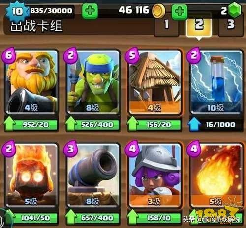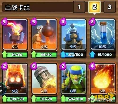 现在热门卡组是一套圣水哥仑加双女巫卡组。胜率好高。好上手。如果要实用的话连弩卡组比较好集到。可以用一下