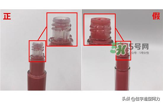 从管头上看阿玛尼红管唇釉真假正品第一次打开时唇膏管头一定是干净的。假货打开就成这个颜色了。正品管口处卡扣很明显。拧到底时会有卡到的感觉。假货没有或不明显。