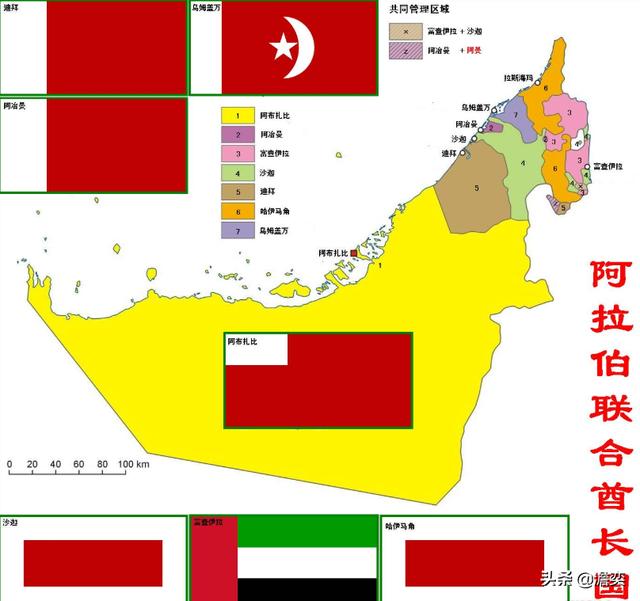 阿联酋是阿拉伯世界唯一的联邦制国家。7个酋长国中6个位于波斯湾沿岸。自西向东依次为阿布扎比、迪拜、沙迦、阿治曼、乌姆盖万和哈伊马角。“老七”富查伊拉位于阿曼湾西岸。“七兄弟”中阿布扎比面积最大。占全国86.7%。迪拜(人口最多)、沙迦随后。阿治曼最小占0.33%。