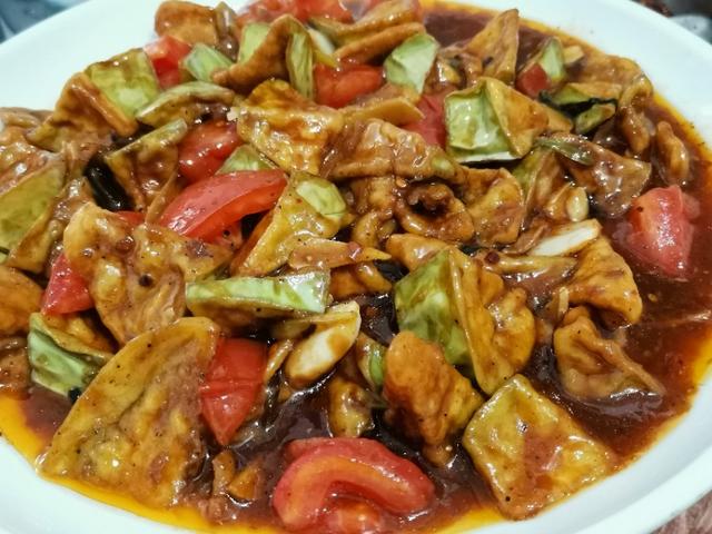 配菜配料:茄子。彩椒。洋葱。鸡蛋。盐。鸡粉。耗油。甜面酱。鸡汁。白糖。番茄。胡椒粉。淀粉葱姜蒜。