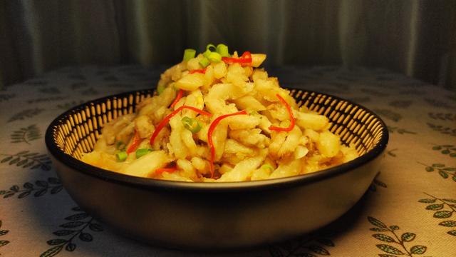 第一步:把茄子削皮切丝。不用太细。除非你家的锅够大。气儿够足。不然不要切太细。饭店可以。