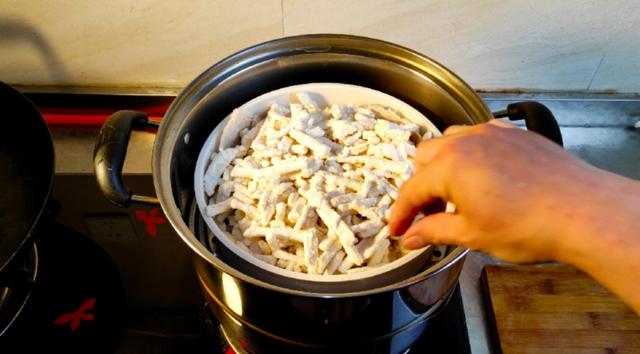 第三步:挂粉。最关键。第一遍挂粉挂小麦淀粉。抖散。第二遍。挂玉米淀粉。增加粘度。第三步。挂面粉。增加香味和营养。挂好粉淋葱油少许。翻拌均匀即可。防止粘连。三步挂粉是关键。这样整出来才够晶莹剔透的嫩滑。吃起来有质感。