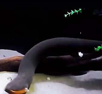 放电捕食:电鳗通常生活在泥泞的浑水中。它们的视力退化。在浑水中本也难看清什么。电鳗利用自己体内的电流。电流如雷达一般。是它们的探测器。利用微弱的电流去“观看”周围环境。寻找猎物。当电鳗发现猎物后。它们会放电进击晕猎物。也还会藏匿自己。远程放电去攻击并诱导猎物。