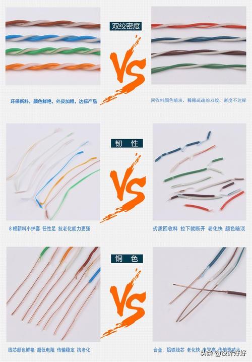 其次。要看网线的质量。好网线外表光洁。印刷字迹清楚。表皮厚实。里面绝缘膜多层。结实。防火。铜芯粗。六类以上的网线铜芯直径应该在0.5毫米以上。越好的网线越偏硬。弯曲度差。折弯半径长。