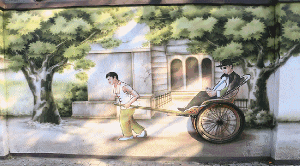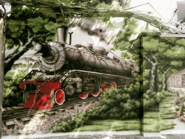 这卷画。展示了随着时间的变换。南京的发展历程。从人力车到小轿车到大巴车再到火车。这些都融入到了壁画之中。