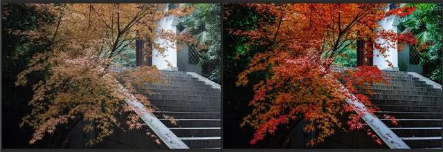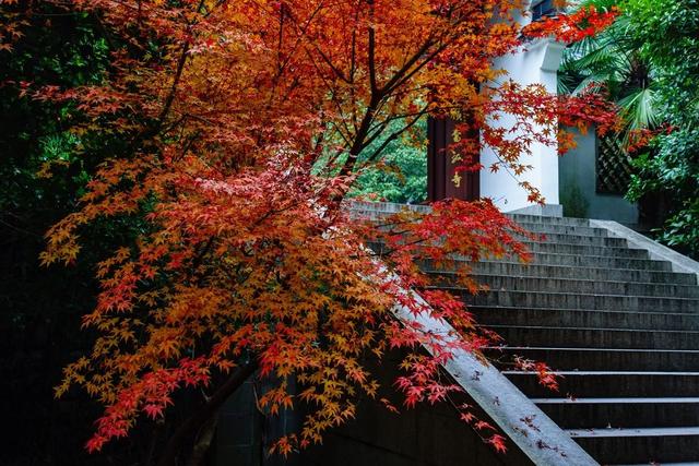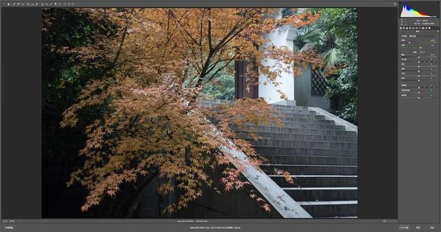 这张图片。我12月初。拍摄于杭州的九溪。舒展的枫叶。占据了画面的大部分。背后隐藏着寺庙。台阶上翻着淡淡的光。画面看起来不错。但颜色有点沉闷。如何增加画面中色彩。突出亮点呢?画面中的主体颜色。是枫叶的黄色。那好。我们来尝试调整它。