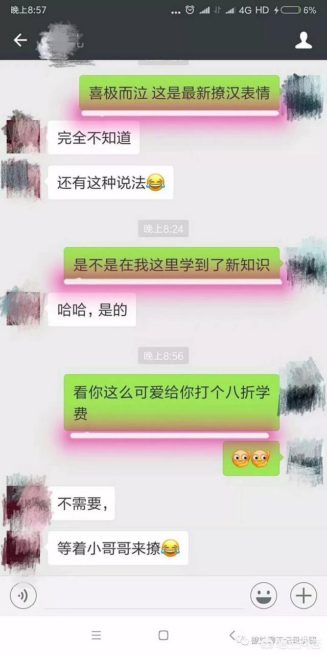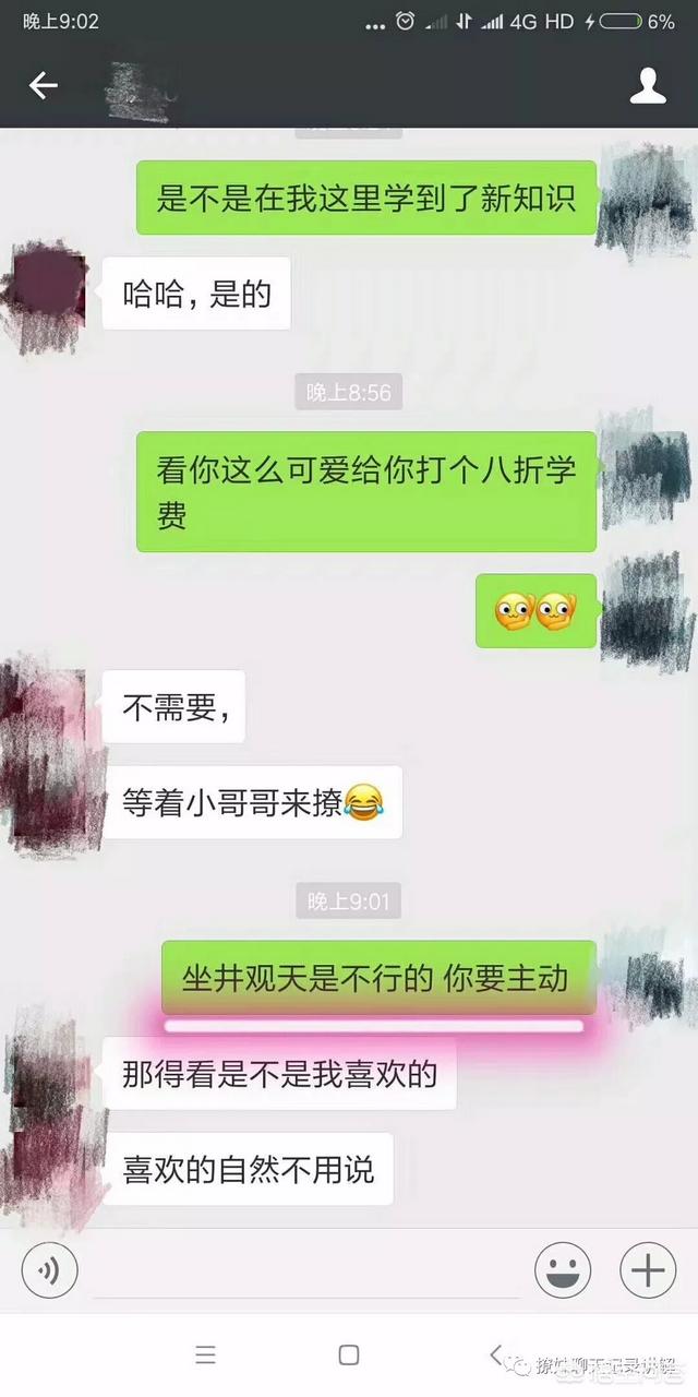 2.下面女生回复就很开心了。成功引起女生兴趣。此刻只需再补一句:“是不是在我这里学到了知识” 把握机会升高自己的价值。当女生回答说:哈哈。是的!女生已经成功被你带领!下面就开始模糊性引导女生投资。“看你这么可爱给你打个八折学费”加个表情带动聊天气氛!下面女生情绪被带到高潮。女生开始主动释放窗口。主动让小哥哥撩!学到了吗?兄弟们!记得关注我们。每天更新聊天案例分析!!