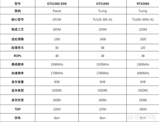 参数上。GTX1060、GTX1660与RTX2060对比图如下: