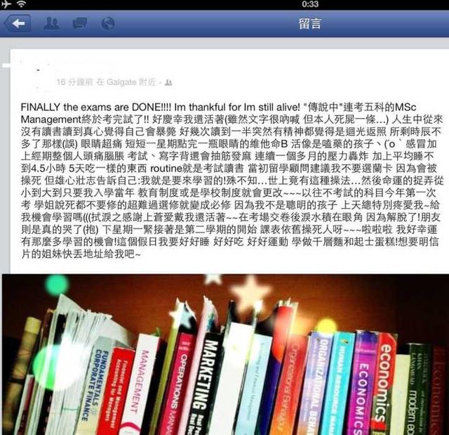但说实话我觉得还好。只要目标不是distinction。也不需要像高考那么高强度地学习...有一位朋友是advance marketing的。天天赶论文做presentation到吐血;另外几位朋友是HRM的。经常有空在宿舍给大家做饭。。。