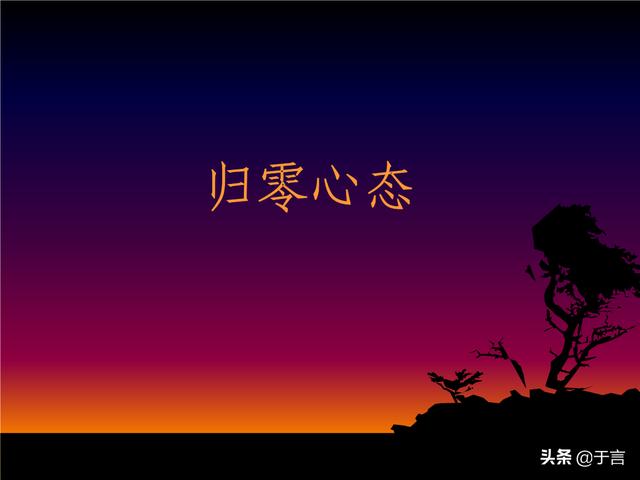 归零心态。也称空杯心态。人的心灵就像一个杯子。时间长了装的东西就多了。需要每隔一段时间清空一次。只有空杯子才能盛下最多的东西。对过往不能够太过于留恋。不要让过去成为现在的包袱。轻装上阵才能走得更远。扔掉过去的包袱。时时刷新自己。这样必能收获满意人生。