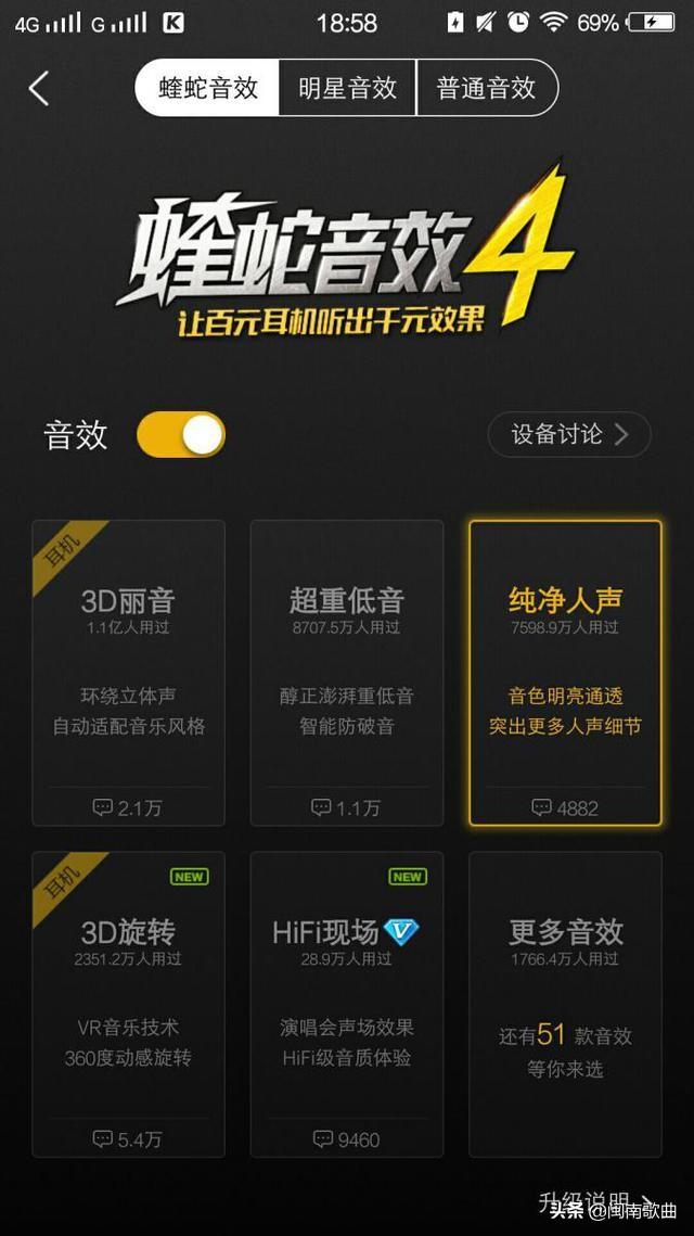 而酷狗的蝰蛇音效是可以直接选择。效果更是好的没话说。3D丽音的使用人数甚至已经破亿。可见人气~
