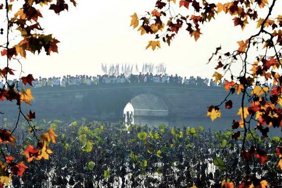 杭州马拉松情侣跑赛程终点西湖断桥。