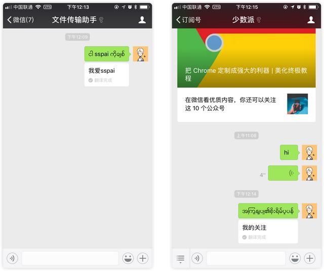 长按翻译其实是一个非常好用的功能。在遇到其他语言时点击即可翻译。但是这个功能也被网友们玩的五花八门。用一些奇怪的语言符号翻译成一句正常的话。比如「ငါ sspai ကိုချစ်」。活用这个功能。你说不定就说出了藏在心里的一份没有说出的爱。也可以整到一大片你想整到的人。注意发送朋友使用微信分组避免造成不必要的麻烦。