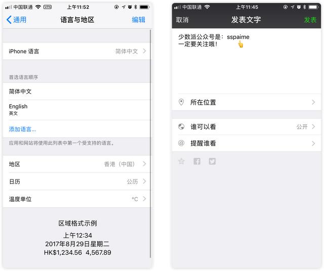 有的用户可能使用了多个社交平台。例如微信、微博、Facebook、Twitter 等等。其他平台我们可以使用 ifttt 即可完成同步。但是微信则不行。其实这里也有一个解决方案。用户可以通过 iOS 的设置将地区修改为香港(中国)。再次打开微信发布朋友圈时。会发现下面除了 Qzone 之外还出现了 Facebook 和 Twitter 的图标。点击绑定授权即可完成同步。然后搭配 IFTTT 完成 Twitter 同步至微博的动作。即可完成全平台的同步发布。