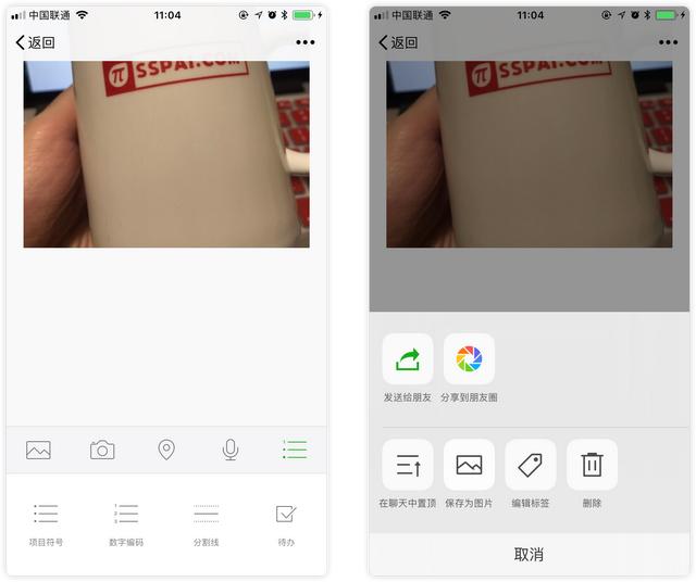 其实微信里也内置了一个备忘录。或者说是「笔记本」。你可以通过「我 - 收藏 - 加号按钮」创建一个笔记。笔记中你也可以记录文字、照片、语音等等。完成后可以分享给自己的好友或者直以图片的形式保存至相册或是分享到朋友圈。在笔记界面底栏的最右侧的图标里。有一个待办的选项。也可以使用它将笔记作为一个简单的购物清单或者 GTD。